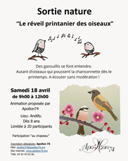 Apollon74 accomplit sans relâche sa mission de sensibilisation et d’éducation à l’environnement en organisant chaque année nombre de sorties nature, projections, expositions et conférences-débats ; tant de façons de faire découvrir les richesses du patrimoine nature haut-savoyard, la biodiversité mais aussi de faire prendre conscience de la fragilité des écosystèmes…